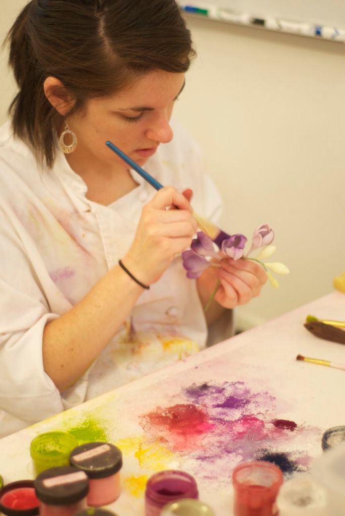 So the next time you see a picture of a cake, pay particular attention to the details. Look at the edges of the flowers, they are all hand dusted to add depth and a more natural quality. Look at the moldings on a cake – that is also done by hand, some times cut apart with an xacto knife and then painted in a metallic gold by a steady hand with a brush. Look closely – every cake we make is unique and customized and the details are really a work of art.