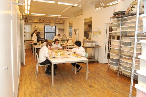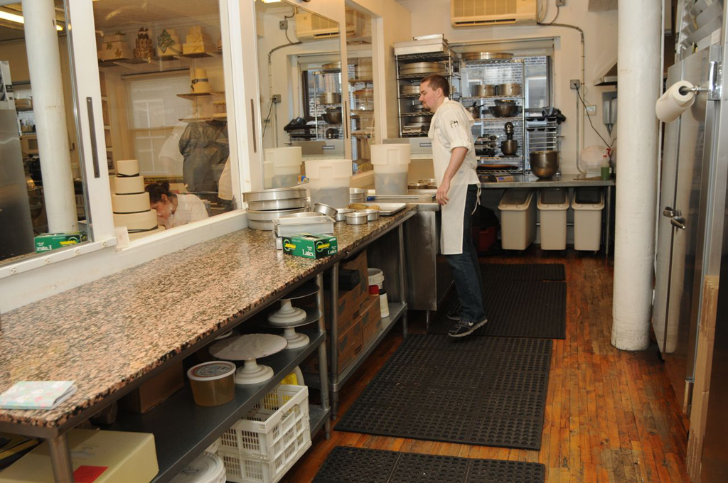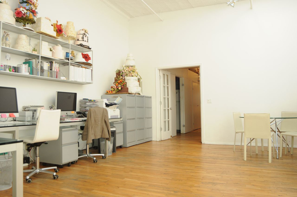 Once you walk through the hallway, you enter our production room. We have a couple of different names for this room, Flower room, Production room, Sugar room. This is where all of the cakes are decorated and boxed after completion.