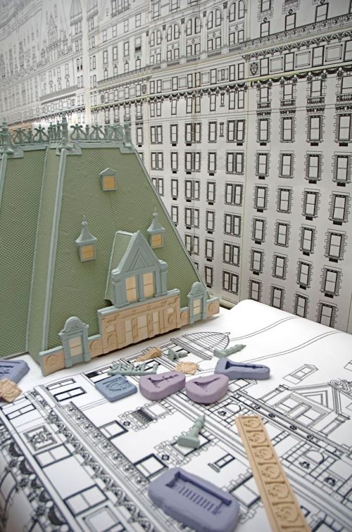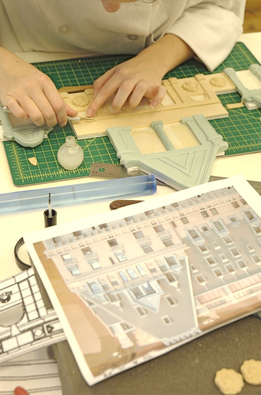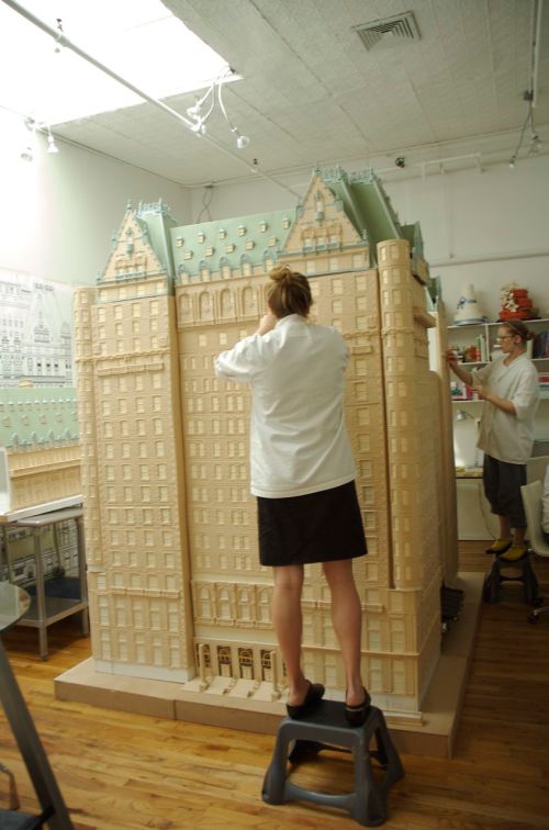 The sugar hotel was constructed in the front office in 16 different sections. The reason for this was we had to be able to move it from our bakery on the 5th floor to the front of the Plaza Hotel under a 20×20 foot tent so we could put the structure back together and then add all of our finishing touches.