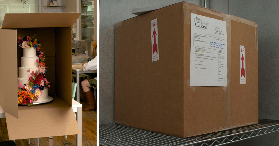 The cardboard box is actually a great insulator and keeps the cake nice and cold. (All of our cakes are delivered cold. The cold keeps them fresh and your clients can keep them out longer at their events while coming to proper room temperature. More exposure for your cake and more bang for your clients buck.)