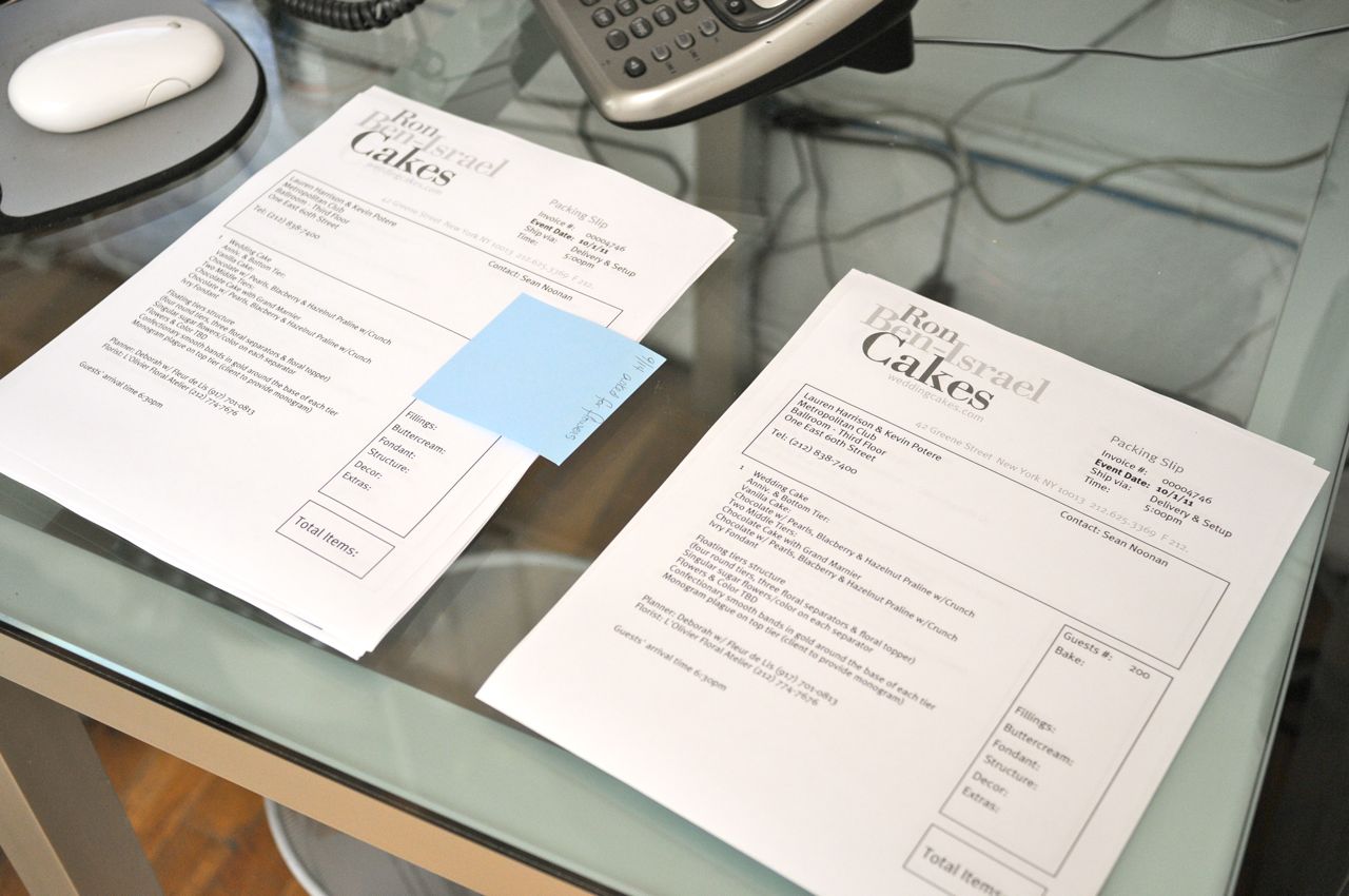 After Ron meets with the client and we come up with a contract describing the cake flavors and design, it’s then my responsibility to make sure that all of the small details that were discussed during the client meeting are followed up on. (Typically I like to have this done almost a month before.) Phone calls and emails are exchanged with our clients’; notes are made on there contracts and updated in the computer.
