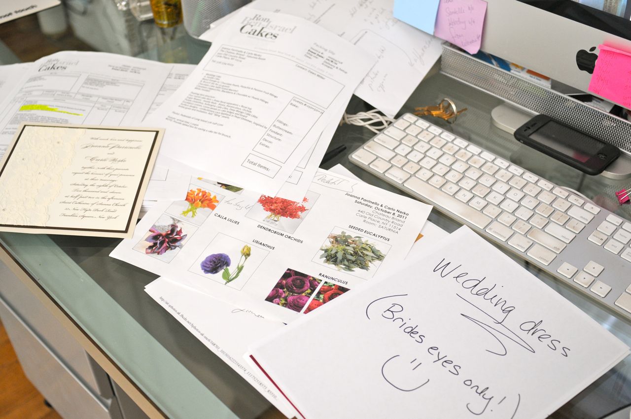 When it’s time to put the month together, I need a lot of desk space. I grab the month’s folder and I start at the very beginning. (What am I in the Sound of Music?) I go through again reading each contract making sure that all of the details have been collected, if not yet received another quick email or phone call goes out. I print the clients packing slip (contract) for the production team and all of the inspirational materials I have on file for them get attached to the slip.