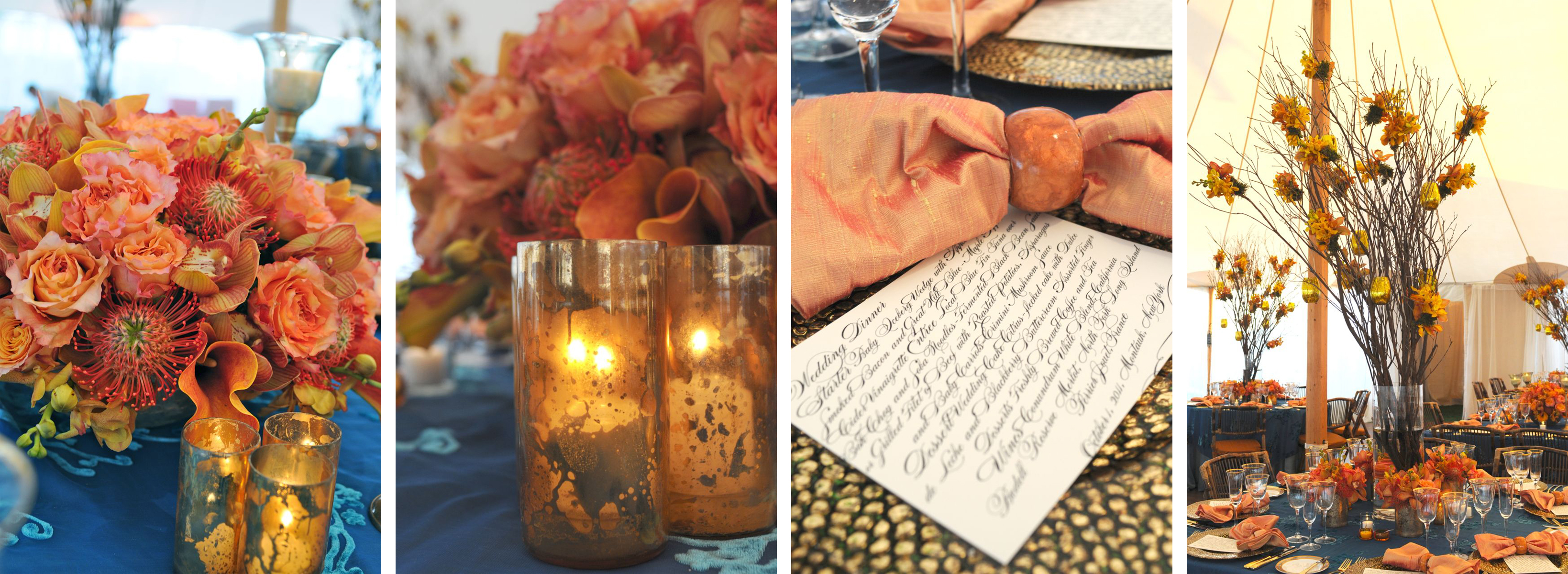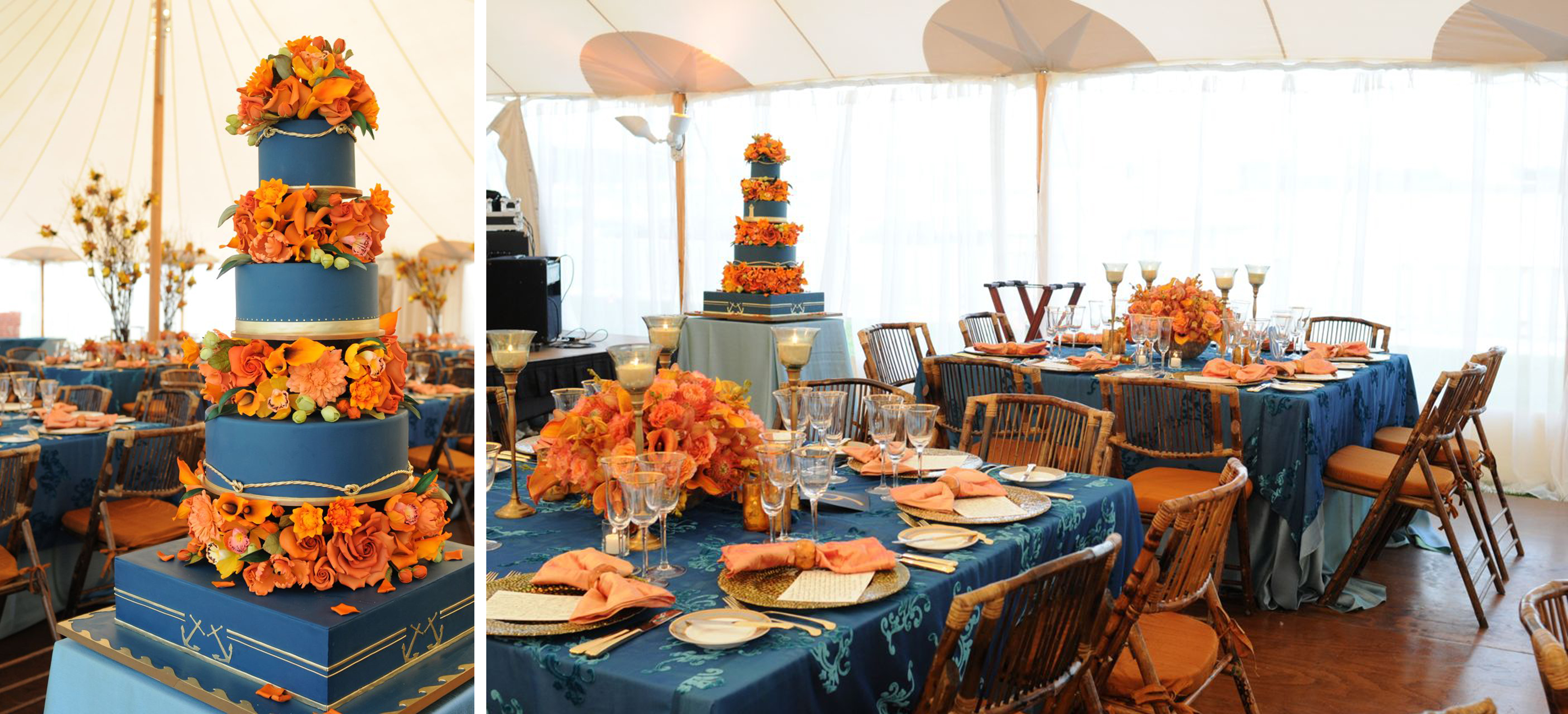 The color palette was a fun one. Bright oranges with a deep blue are perfect for an early fall wedding.