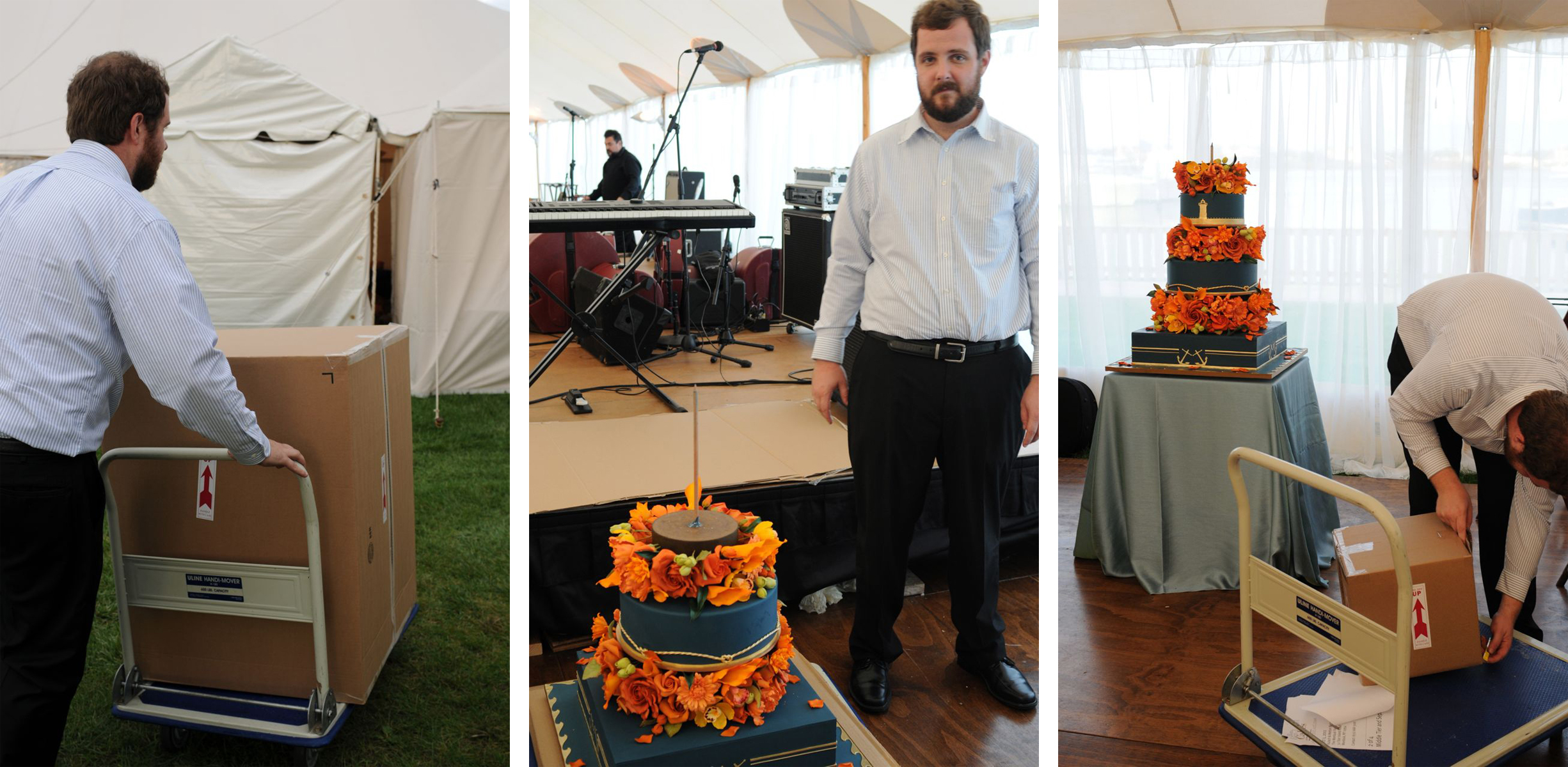 Our driver Ed is trained in setting up cakes as well. It takes two of us to set up on sight.