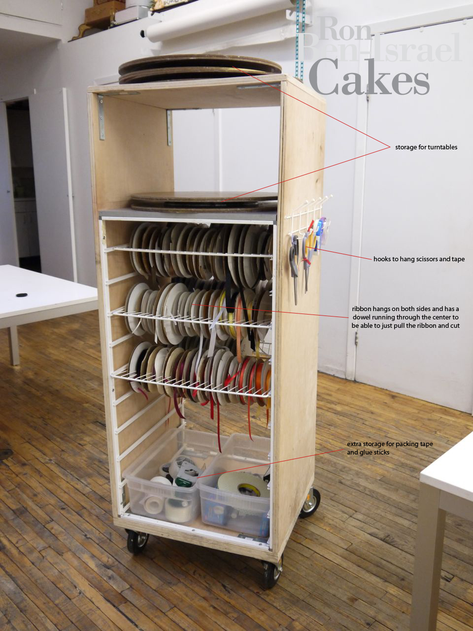 It’s true. We are a bakery in New York City and only have so much space for everything we need to get our jobs done. So for us it’s all about organization. When a cake goes out of our bakery it is “finished” in every sense of the way. This includes the board the cake sits on. We don’t just leave the edges plain; we cover the edges in ribbon. It finishes the complete look of the cake. The question is, where do we keep all of that ribbon? Our head chef Jeffrey made us a fancy ribbon cart that we can store in the closet and roll out to the worktables. Having something like this streamlines one little part of our process. But when you are organized in what you do, it allows you to focus on the bigger things.