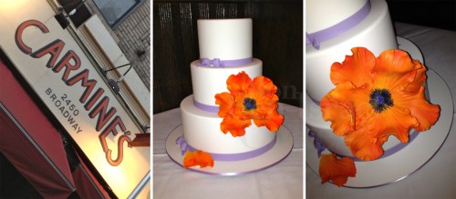 The cake was three tiers in white fondant with lavender confectionary bands and bows with a bright orange sugar poppy. The flavor was vanilla cake with caramel buttercream. Yummy!