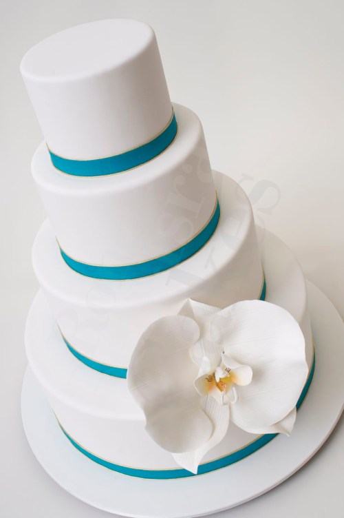 Ron has designed thousands of wedding cakes in his career.  He has his formula for a consultation and designing a wedding cake.  Some of our clients sit at our table and want everything on their cake.  And then we have some clients that take the less is more approach.  Sometimes designing these kinds of cakes are a bit more difficult because of all the blank space.  A little pop of color in the confectionary textured bands and a strategically placed oversized flower can be an amazing work of art.