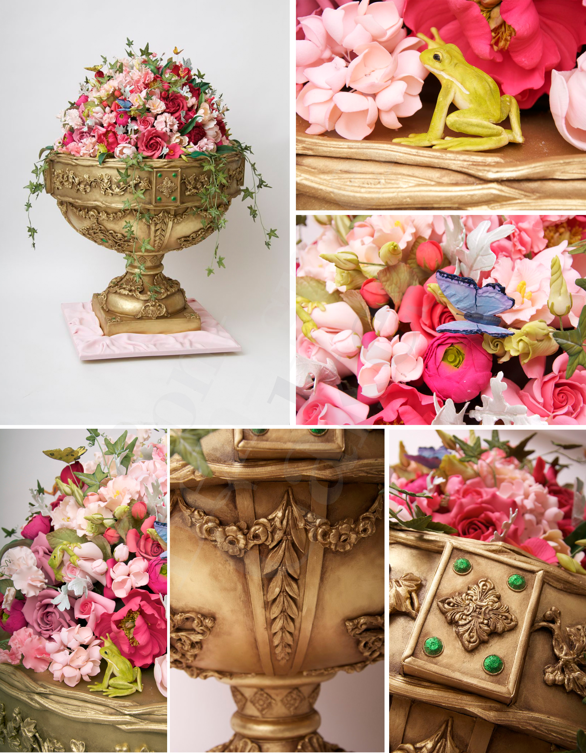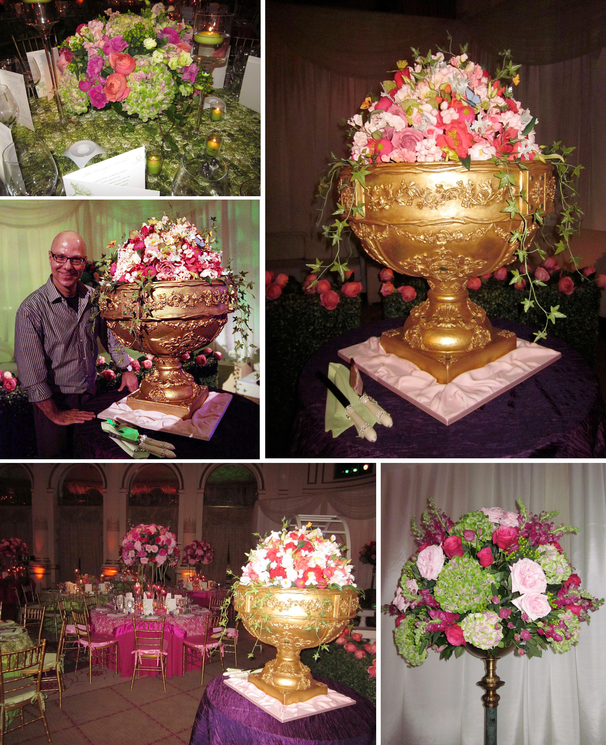 We create cakes for any occasion. We had a client that requested for their wedding cake an “enchanted garden” theme. Ron designed for them a large gilded urn filled with bright colored sugar flowers that you would find in an English garden.