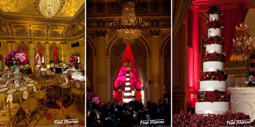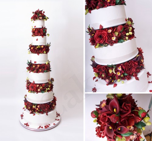 The design of this cake is elegant and chic. The reason why this cake is “over-the-top” is because of its size. The cake when completed was almost 6 feet tall. Between each layer of cake is a floral separator. This is a faux tier made of styrofoam, covered in green fondant. The sugar flowers are then set inserted into the stryrofoam, these are placed between each tier of cake and when doing so, doubles the height of the cake itself. We assemble the cake in the bakery to make sure it all goes together before being set-up on location. When packing this cake for delivery, it will be put in multiple boxes and assembled on sight.