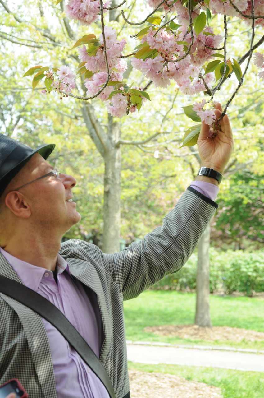 Ron at the Brooklyn Botanical Garden examining Cherry Blossoms.