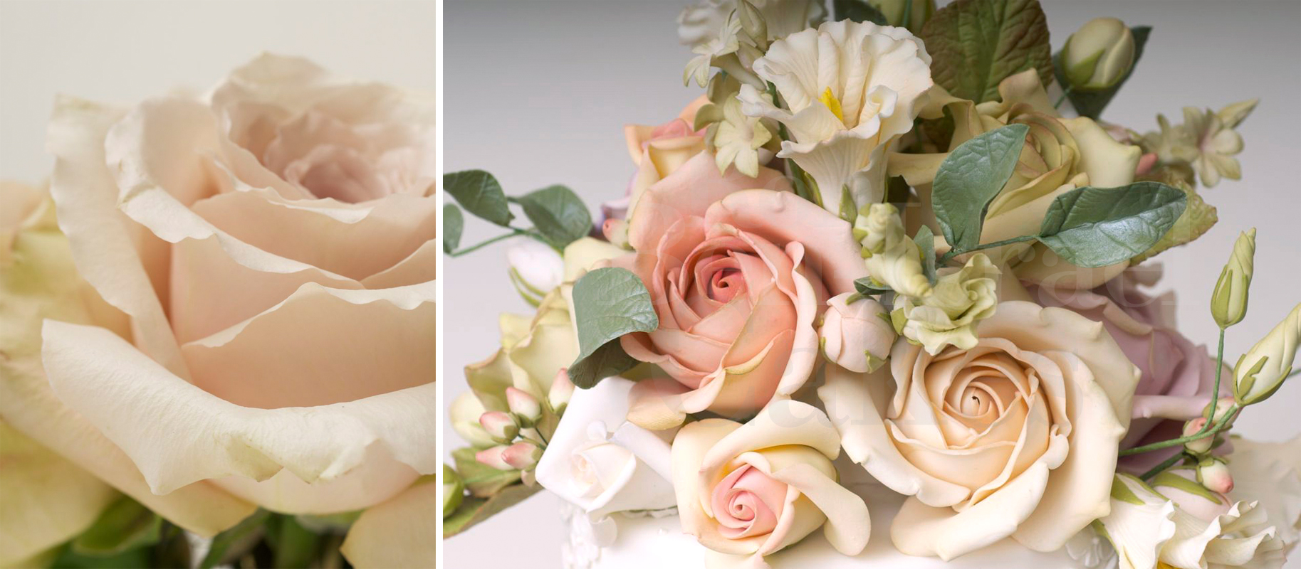 The real rose is on the left. Ron's sugar roses are on the right. His challenge is getting the curve of the petals to be delicate and fragile, just like in nature.