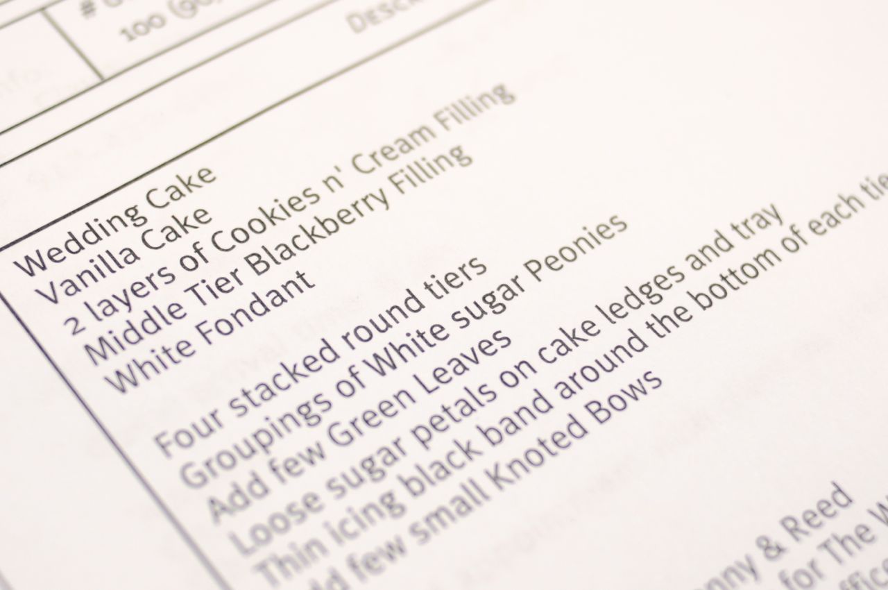 Are your cake fillings and flavors correct? Does it say how many tiers of cake you are getting? Does it specify the flowers on your cake are real or made of sugar? Is the language representing the surface design something you can understand? Do they have the correct arrival time of your guests? Is the date of your event correct? Do they have the correct address of the venue?