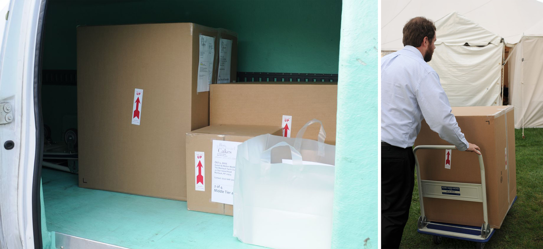 No place for the cake inside? Rent a refrigerated van and keep the van behind the tent out of site from your guests. That way you can keep your cake cold until you reveal the cake for your cake cutting. The second option is a bit more expensive, but will keep your cake from melting. If you have never seen what a little water and humidity can do to fondant – it’s not pretty.