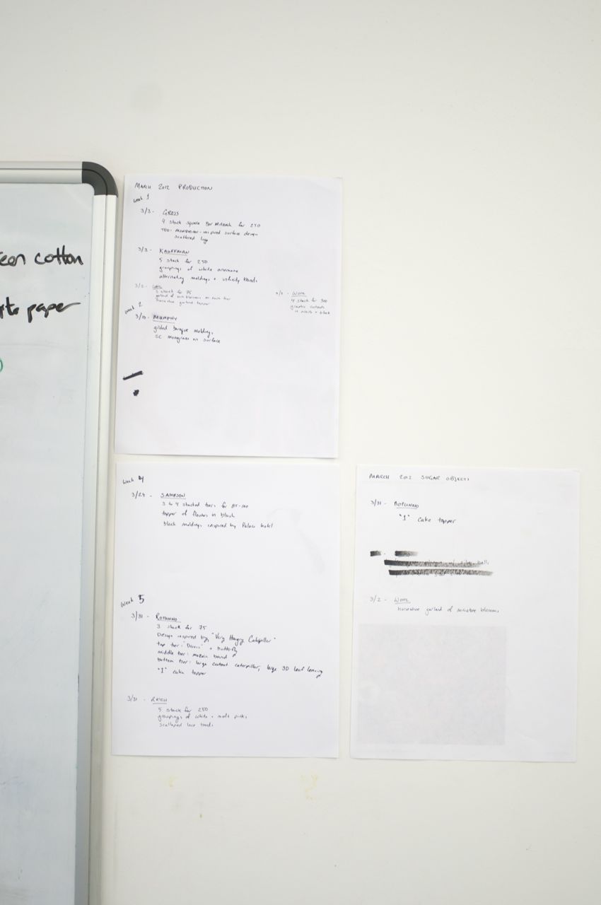 After the meeting, our production manager Jason reads through all of his packing slips (that’s what we call our orders) and he starts to write a list of all the sugar flowers that need to be made and keeps it on the wall in the production room. When the flowers are completed they are checked off the list. Jason also gives Ron his “Honey Do” list of Roses and other flowers that Ron makes to be completed. We do this a few months ahead because of Ron’s schedule.