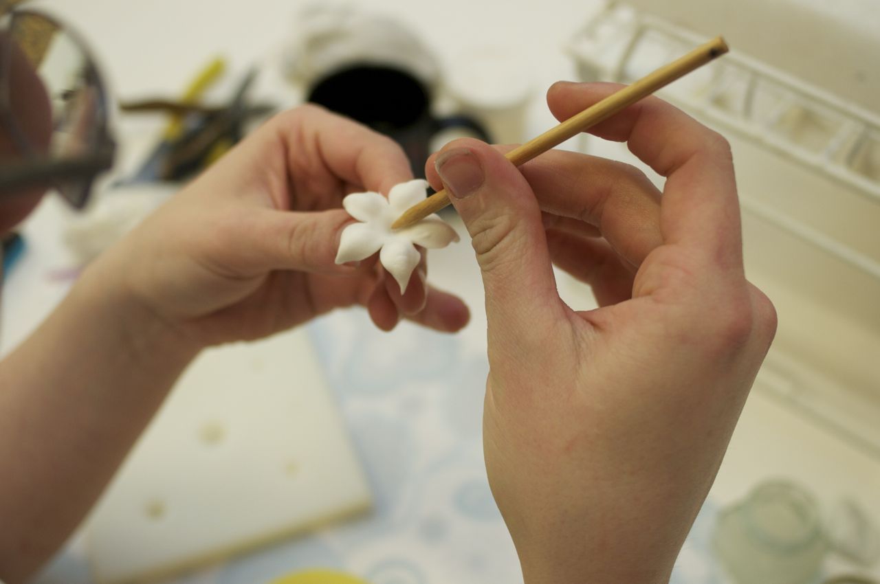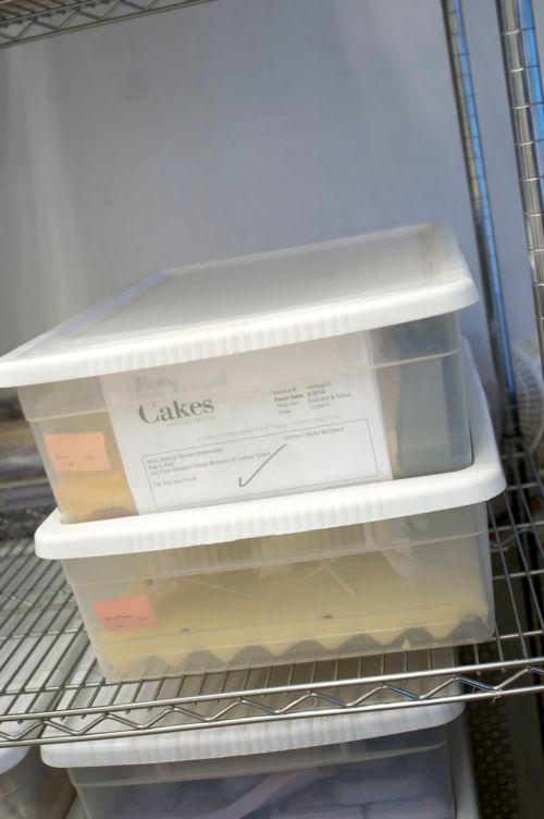 Two weeks before the cake needs to get done, Jason takes each packing slip and pulls the flowers out for the cake and puts them in a plastic box, the box is labeled and stacked on the shelf. Once the cake is fondanted and stacked from the kitchen, it’s passed on to the production room to start the decorating process. Depending on the design they have between 24-48 hours to complete each cake. The cake then gets boxed up and put in the refrigerator and awaits delivery.