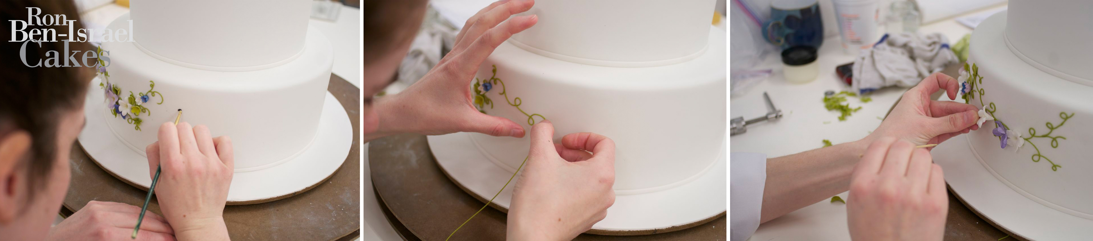 Our confectionary artist, Sarah, created the vines with water, a steady hand and a "noodle" (made of sugar paste). Then applied the delicate sugar flowers to create the swag wreath around each tier.