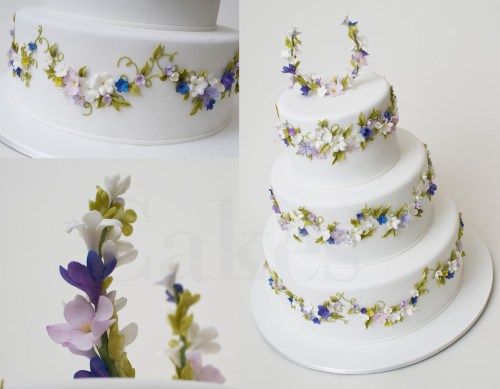 The finished cake. Many delicate sugar flowers were applied to create the wreath affect that around each tier. The topper was created with wired flowers.