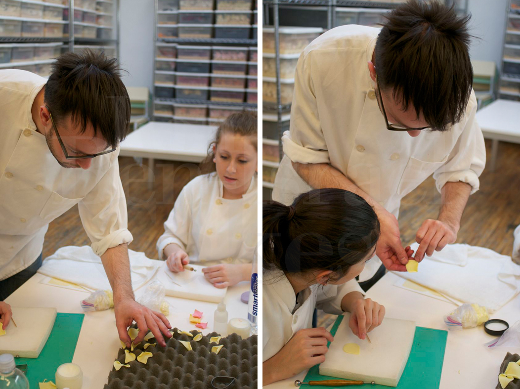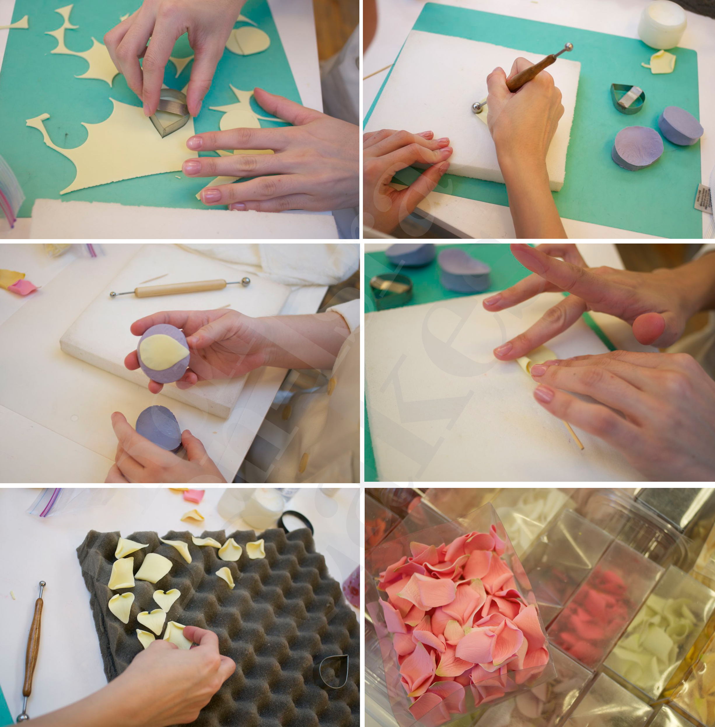 Today’s project – making the rose petals that you see gently placed on the ledges of our cakes. This is seems like a simple project, but really it’s not. Each rose petal goes through it’s own process and like in nature, no two things look a like.