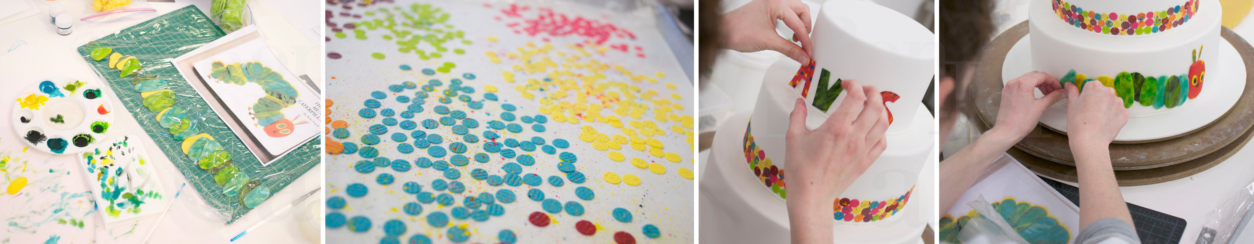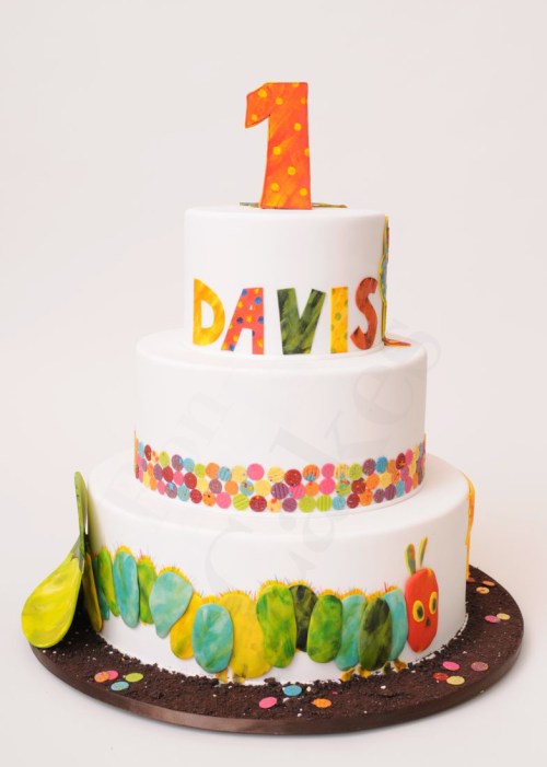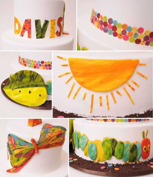 I think this year my favorite thing to design are the 1 year old birthday cakes. There is so much to be inspired by. Our client Ashley came to us a few years ago for her bridal shower cake. She recently came back to design a cake with us for her son’s first birthday. The inspiration she gave us? One of my favorite children’s books, “The Very Hungry Caterpillar” by Eric Carle.