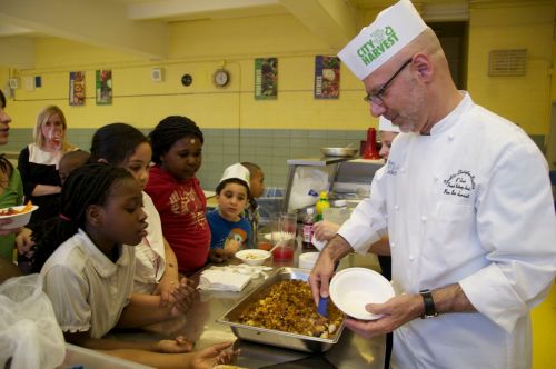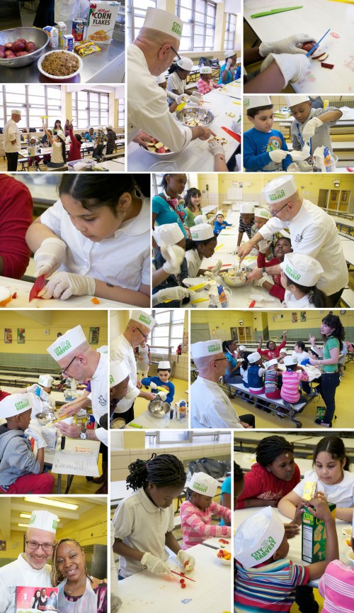 Yesterday Ron went to school at PS 59 in Brooklyn to participate in City Harvest’s Cooking Matter’s for Kids program to give a few hours of his time. This program engages elementary school students in cooking healthy meals and promoting a healthy lifestyle. Ron was there to celebrate their graduation of the program and share his healthy fruit crisp recipe and cooking tips with the students.