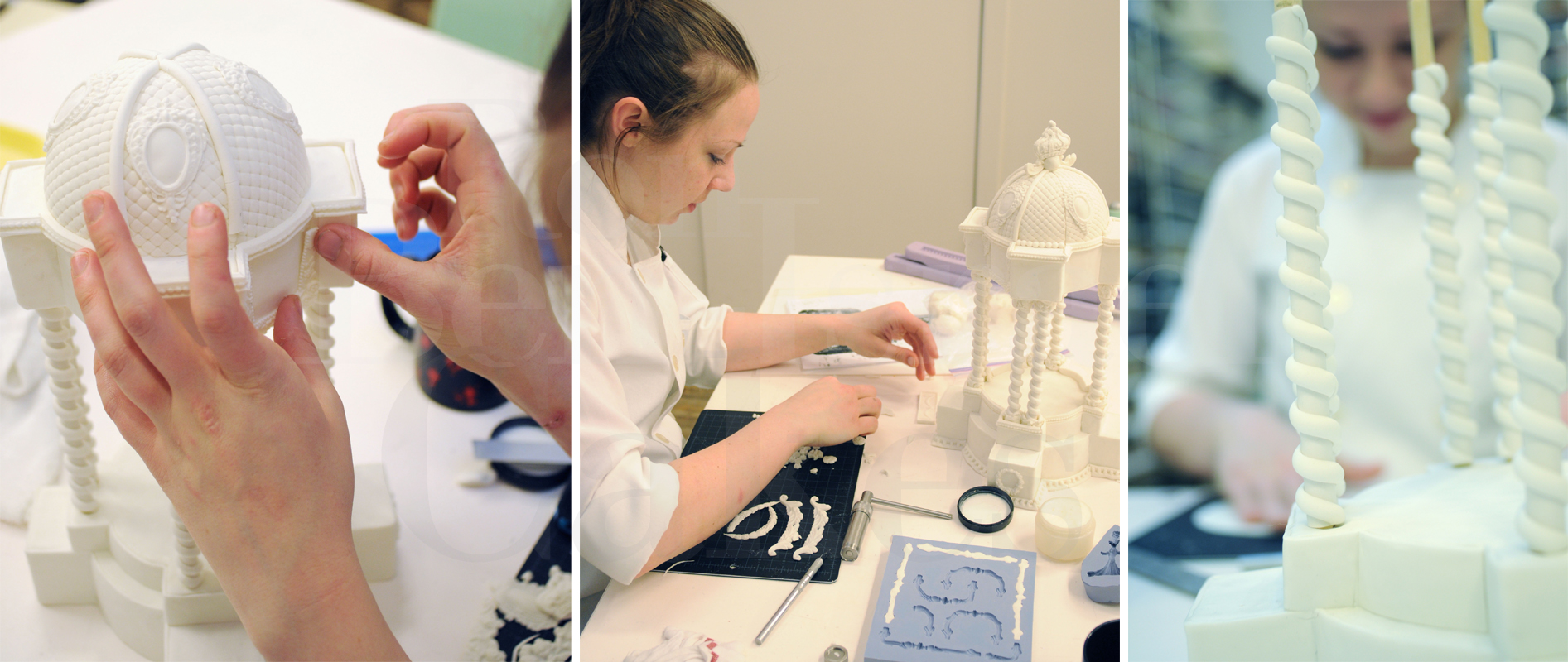 When we start a project, we dissect it to get the proportions right and then enlarge it so we can make sure our confectionary decor will be to scale.