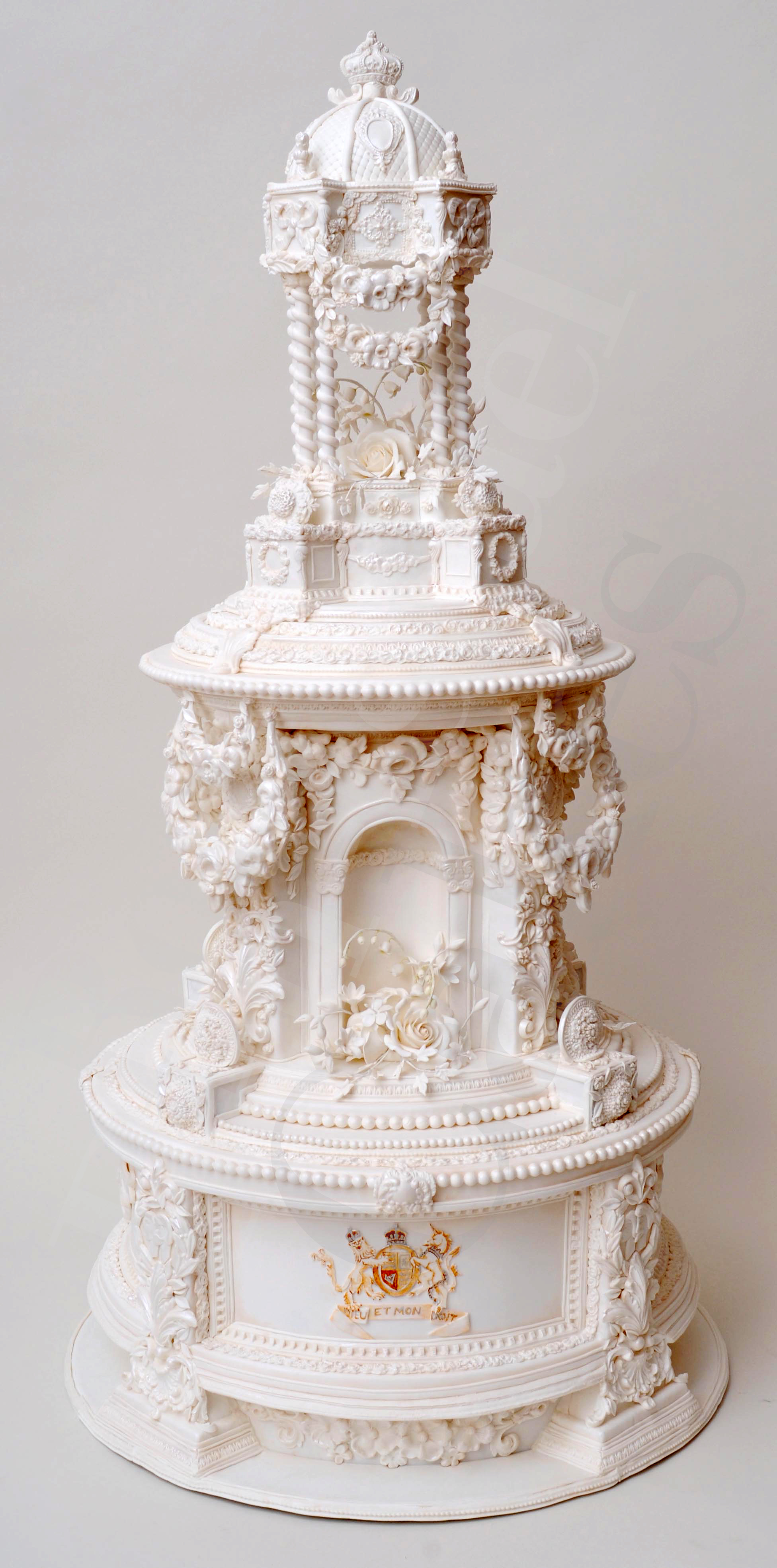 This was a very exciting project for us.  The editors of Brides magazine came to us in February and asked us to recreate a specific cake for them.  The cake that they asked for was the wedding cake of Princess Victoria of England and Frederick William of Prussia from 1858.  There are no photographs of this cake, but only a sketch.  WE jumped at the chance to be able to recreate this intricate work of art that was inspired by the St. Bride’s church in London.