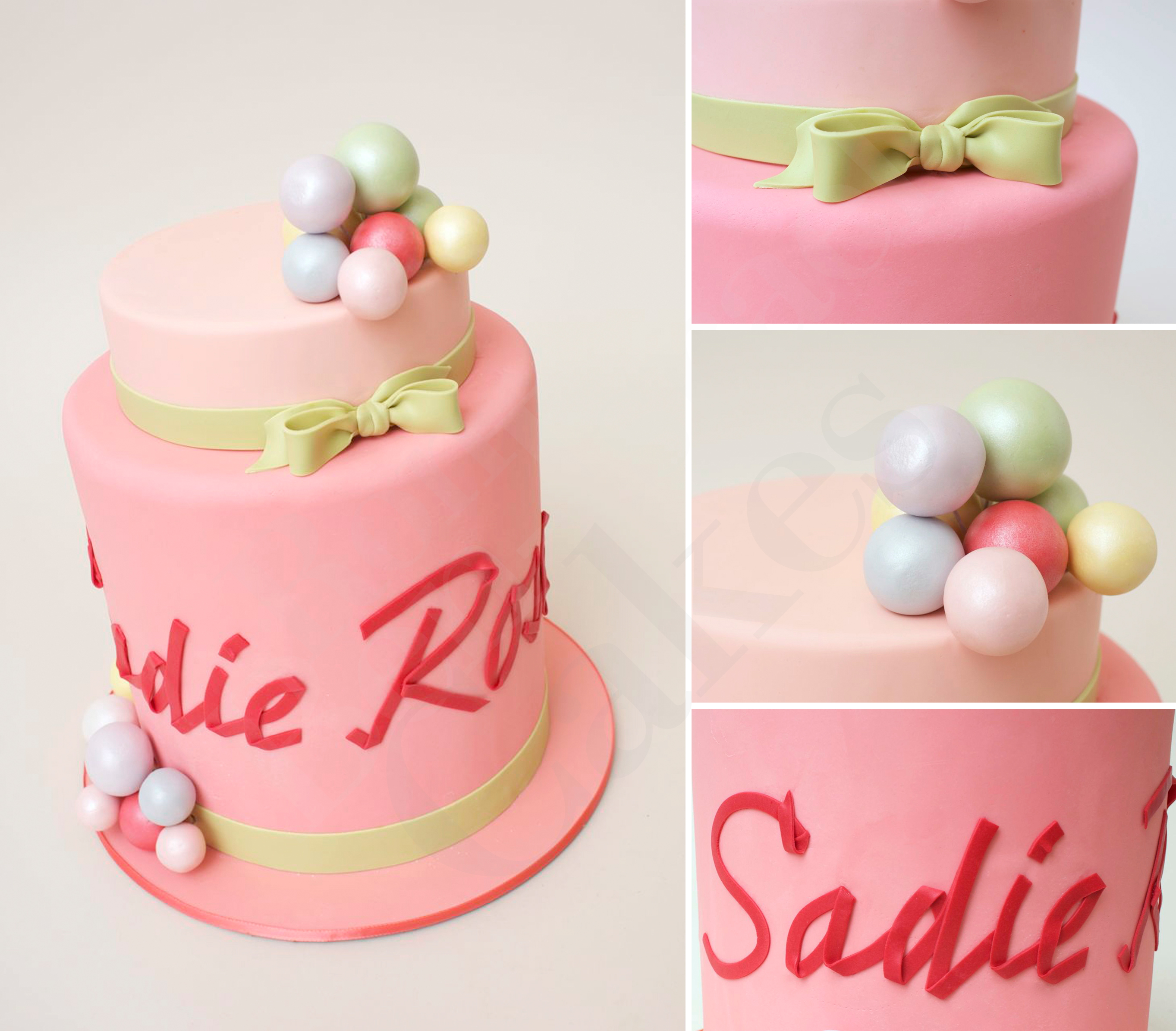 Here is our finished cake. Not every design needs to be complicated. This cake is simple and sweet but has big impact with the colors and a few confectionary accents with the bubbles and bow.