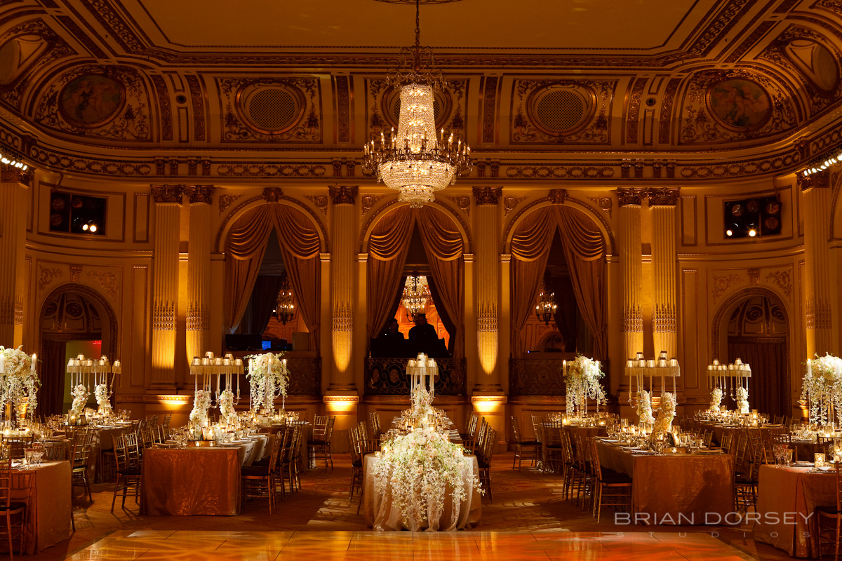 The Plaza Hotel Ballroom, filled with beautiful white flowers and custom candelabras to compliment the romantic atmosphere.