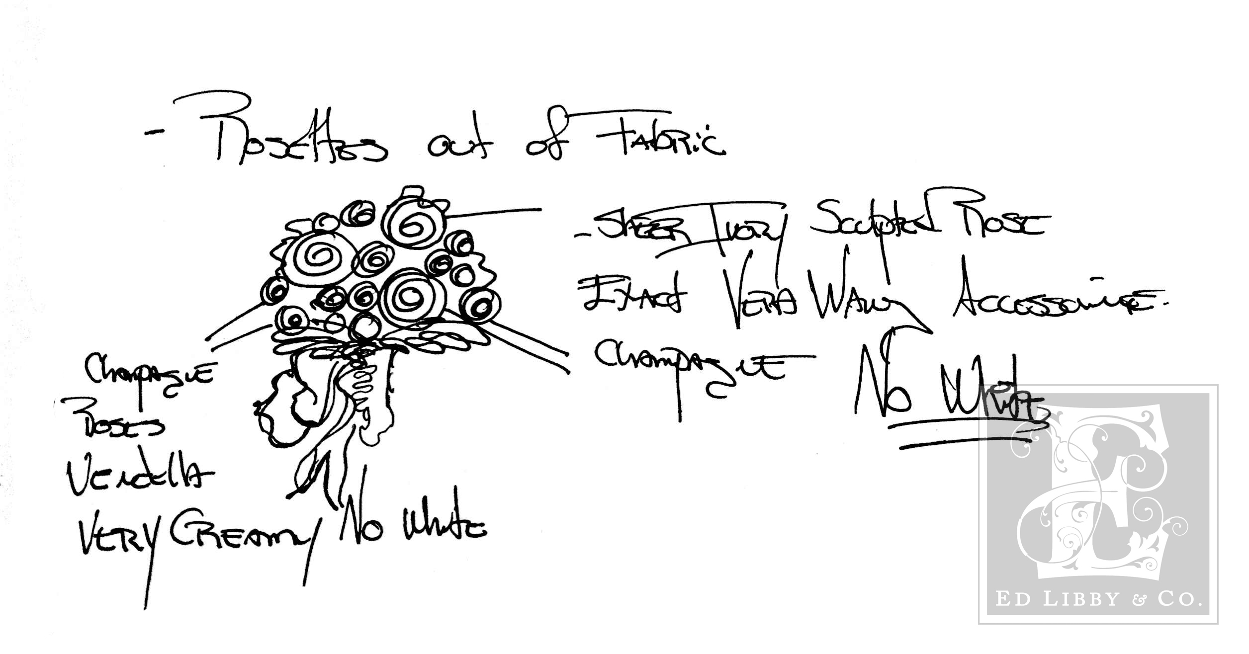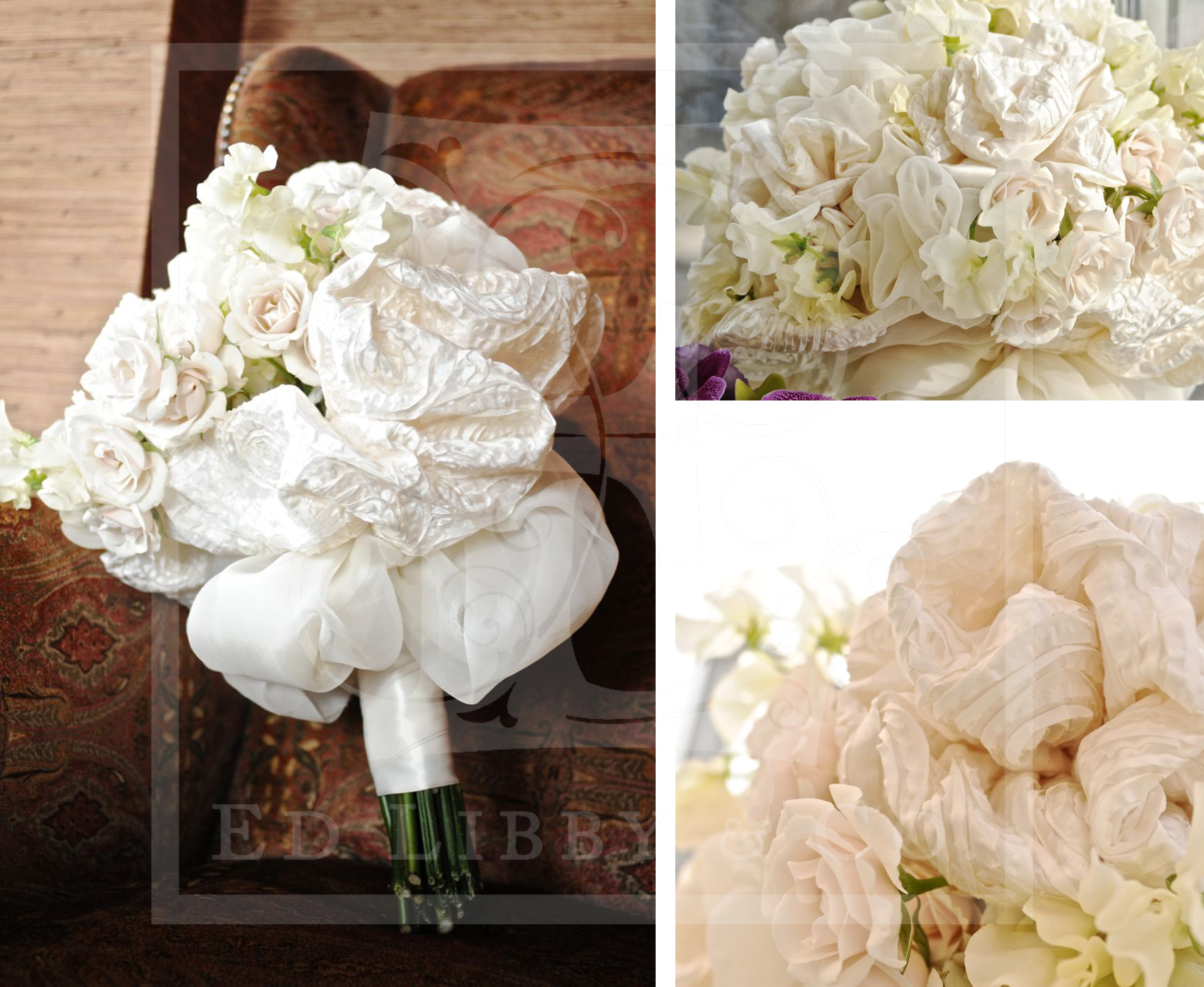 Of course Ed walked away with a million ideas. He translated his visit into a beautiful bouquet of sweet peas, hydrangea, spray roses and sculpted flowers out of silk organza and a raw silk textured fabrics. The end result is breathtaking. Light, airy and full of whimsy. A beautiful bouquet for any bride!