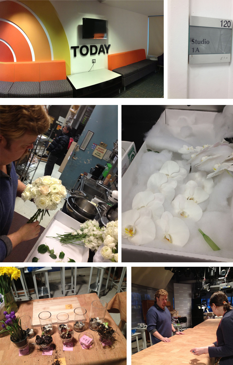 There were many emails that went back and forth between our office manager and Macy’s/Today Show (Macy’s invited us to do the segment because of our involvement with the flower show).  Then there was a few hours spent at the flower market picking out flowers.  Even this part is well thought out, you want something that is going to “read” well on television and you want something big enough to see.  Once the flowers were picked out, they were delivered to our studio where the flowers needed to be conditioned, but we didn’t have that kind of time, so we forced the flowers to do what we wanted. (There is a way to do this…perhaps another blog post?)  Typically you want a few days for the flowers to “condition”.  Ed and I packed everything up and went to the set the night before the morning segment to set up with the producer and props director.  It took Ed an additional 3 hours of flower arranging onsite to finish up.
