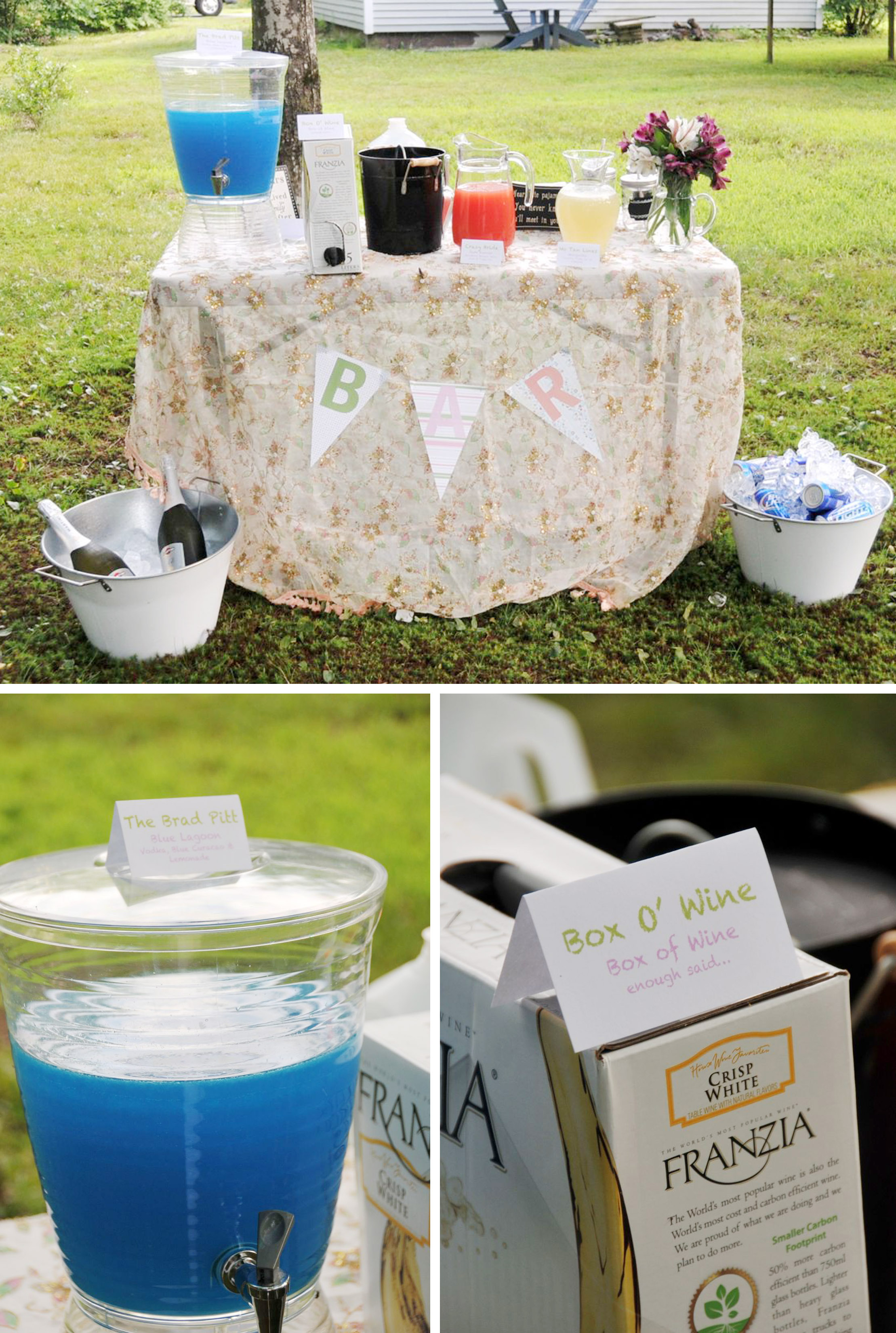 So I took all of Steff’s favorite things and we celebrated her bachelorette in her backyard (it was a surprise!) I created a dinner space, a regular bar with themed drinks (of course they had little name cards – remember things we see on Pinterest!) and s’mores dessert bar. (These are some of Steff’s favorite things…) My dear friend Sharon’s husband came up with an amazing playlist of music. Because we were celebrating with themed cocktails, we pitched tents in Steff’s backyard and went camping! (That what no one had to drink and drive…we are a responsible bunch after all!) Steff loves her friends, camping, lobster, s’mores, good cocktails and great music. We had an amazing night – there was lots of laughter and great memories were created. Steff loved every minute of it!
