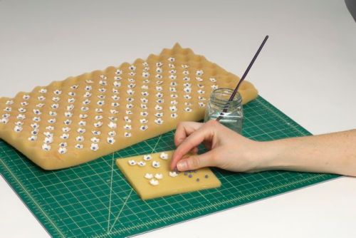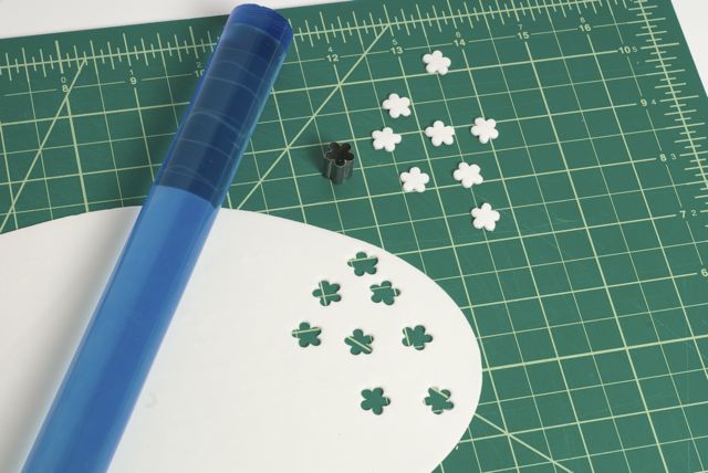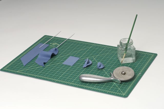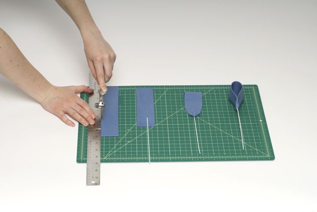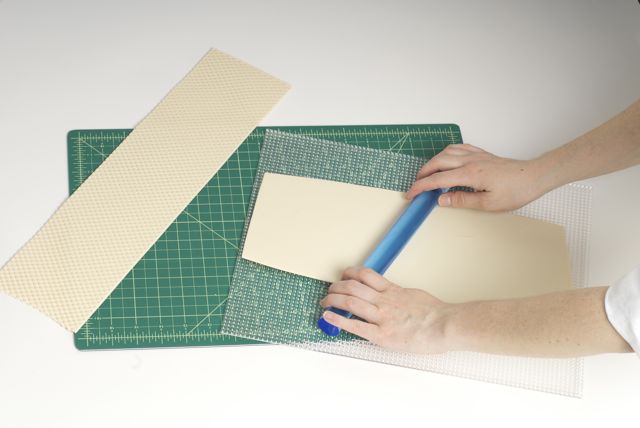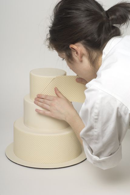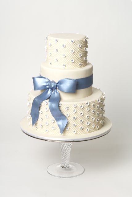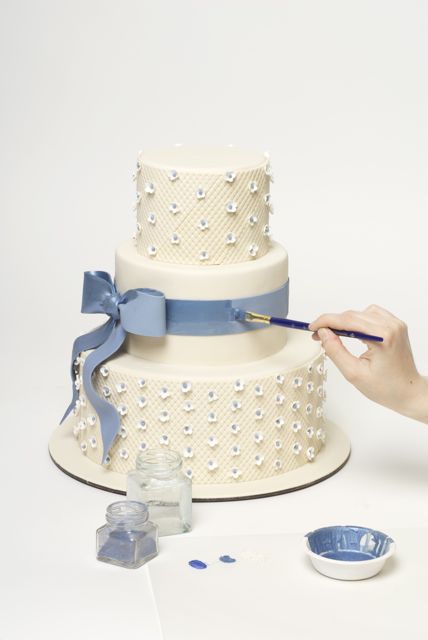 1. Stack three round cake tiers, iced in butter cream and a thin layer of Ivory Satin Ice fondant. (We used 10” + 7” + 5” cakes on a 13” board.)2. Roll thin strips of Ivory Satin Ice fondant on a textured board to achieve quilted pattern. (Ron uses a Lucite florescent lighting cover.)3. Measure the circumference of the top and bottom tiers, and trim strips along the diagonal line.4. Lightly brush the back of each fondant strip with water and apply to the bottom and top tiers.5. Line up the diagonal seams to meet each other.6. Roll out white Satin Ice Gum Paste and cut out flowers using a small blossom cutter.7. Cup flowers with a ball tool against a piece of soft foam. Set flowers aside to dry.8. Roll small balls of Blue Satin Ice fondant and attach to the center of each flowers with a bit of water.9. Using the quilted pattern as a guide, apply the blossoms in a Swiss dot pattern.10. Roll Blue Satin Ice fondant and cut into strips. Moisten the edges with water, place a wire or a skewer, fold the ends and fasten while cinching into a loop. Let loops dry sideways.11. Prepare two tails & a small strip for the knot. Those will be applied to the cake while still flexible.12. Apply a band of Satin Ice Blue fondant around the middle tier. Then attach bows, tails and the knot by inserting wires and moistening backs of the decorations to secure.13.Mix powdered shimmer colors with clear alcohol and paint all decorations to a satiny finish.14. A sweet and romantic blue and ivory cake!