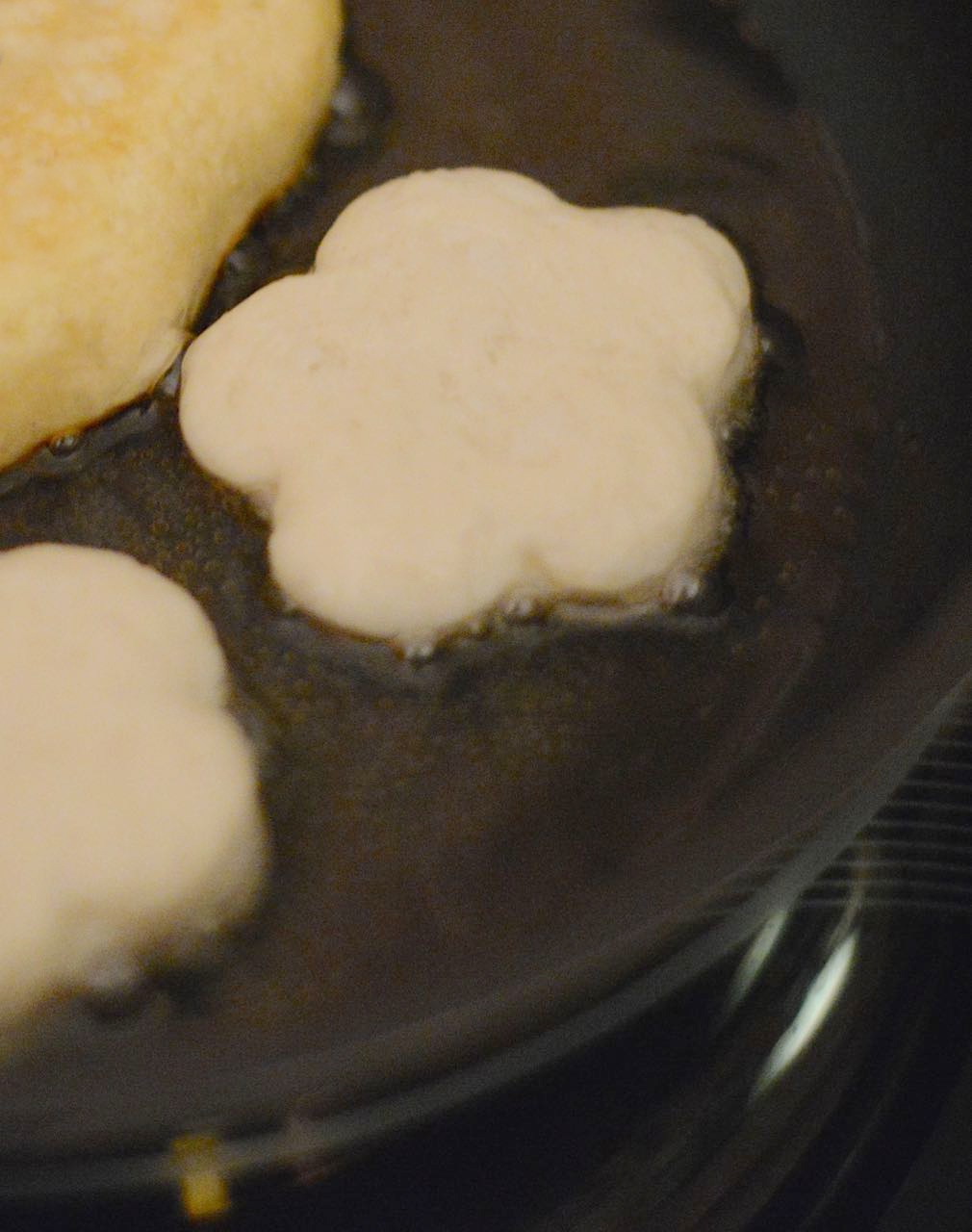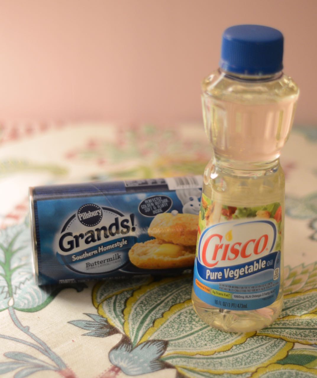 Grands already made buttermilk biscuits and whatever oil you want to fry in.Pat out dough and cut with your favorite cutter.Fry in a skillet. I used about a quarter inch of oil. ( I kept turning them so they wouldn’t burn.)I took 2 tablespoons of pre made frosting from the can and melted it in the microwave for about 30 seconds. Stir until smooth. Dip your donut.Now eat it! You can get really fun with different frosting flavors and sprinkles. Or you can pipe in your favorite jelly (mine is Aunt PJ’s apple cider jelly) and dust with powdered sugar.