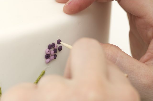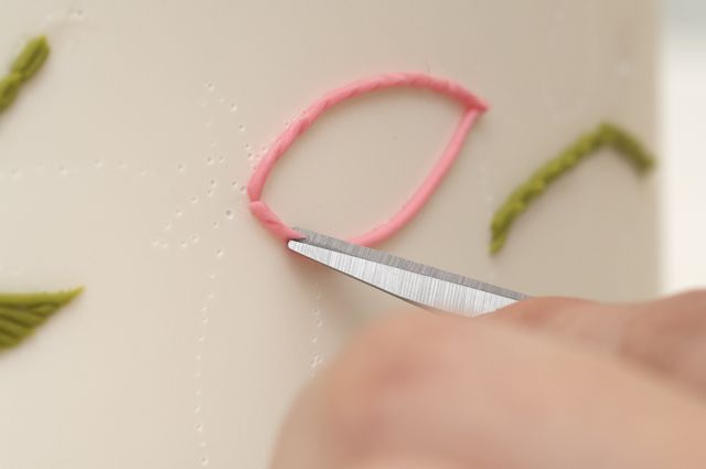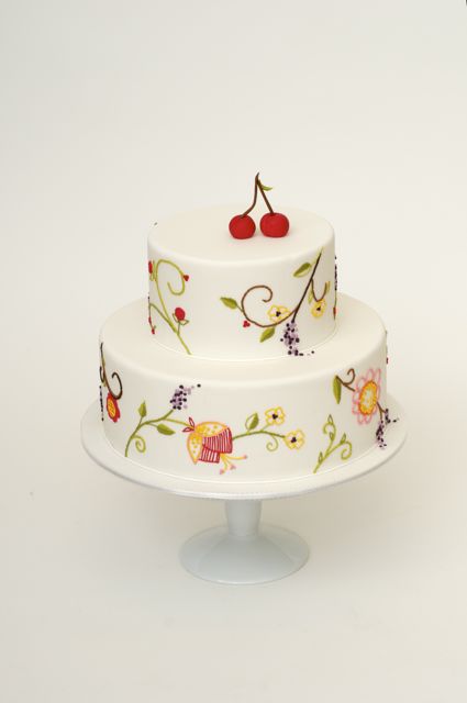 1. Using a measuring tape, note the circumference of each tier.2. Cut a long strip of parchment paper to fit the full length and height of each tier.3. Draw design on parchment template. Here we were inspired by vintage crewelwork from Turkey.4. Pin parchment template to cake and score your design. Remove parchment.5. Fill extruder/clay gun with colored sugar paste. You could use pre-colored Satin Ice Fondant or tint some Satin Ice gum paste.6. Use these 4 techniques to achieve embroidery effects on the cake surfaces – use one or a combination of all four.7a. Split Stitch – adhere two noodle strips to the scored lines on the cake, using a fine brush, moisten the back with water.7b. Using a pair of small sharp edged scissors, snip into the paste noodles.8. Straight Stitch: – apply one noodle strip and cut in the same fashion for a split stitch.9. Satin Stitch – moisten area with water using your paintbrush, apply noodle strip in one direction and cut with xacto knife.10. French Dot – roll small balls of paste; moisten the back with water, and using a toothpick apply to the cake. Add a little pressure with the toothpick to mark a hole in the center of each ball.11. Finish cake with confectionary cherries (can be made out of marzipan, sugar paste or Satin Ice Fondant).