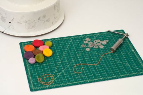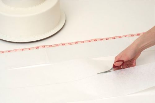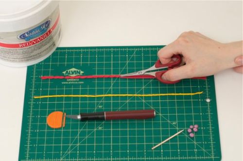 Equipment list: measuring tape, parchment paper, pencil, tape, pin, colored sugar paste or Satin Ice Fondant, clay gun/extruder, paint brush, small sharp edged scissor, xacto knife and marzipan